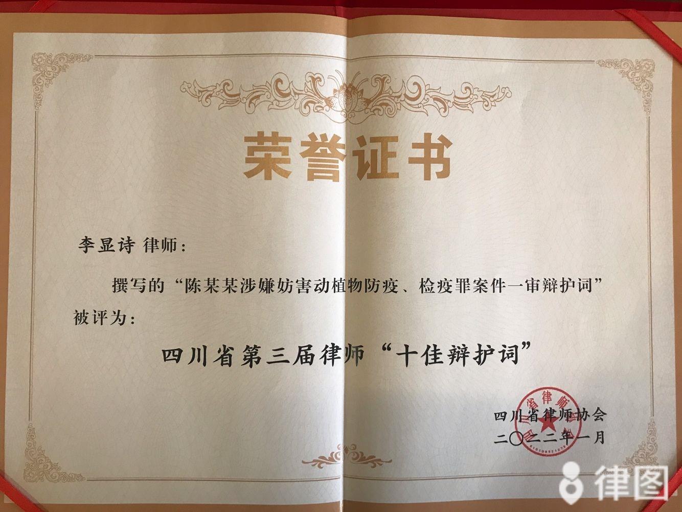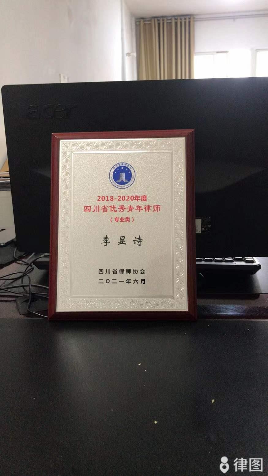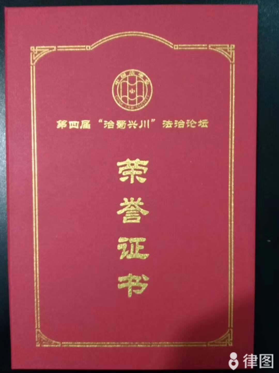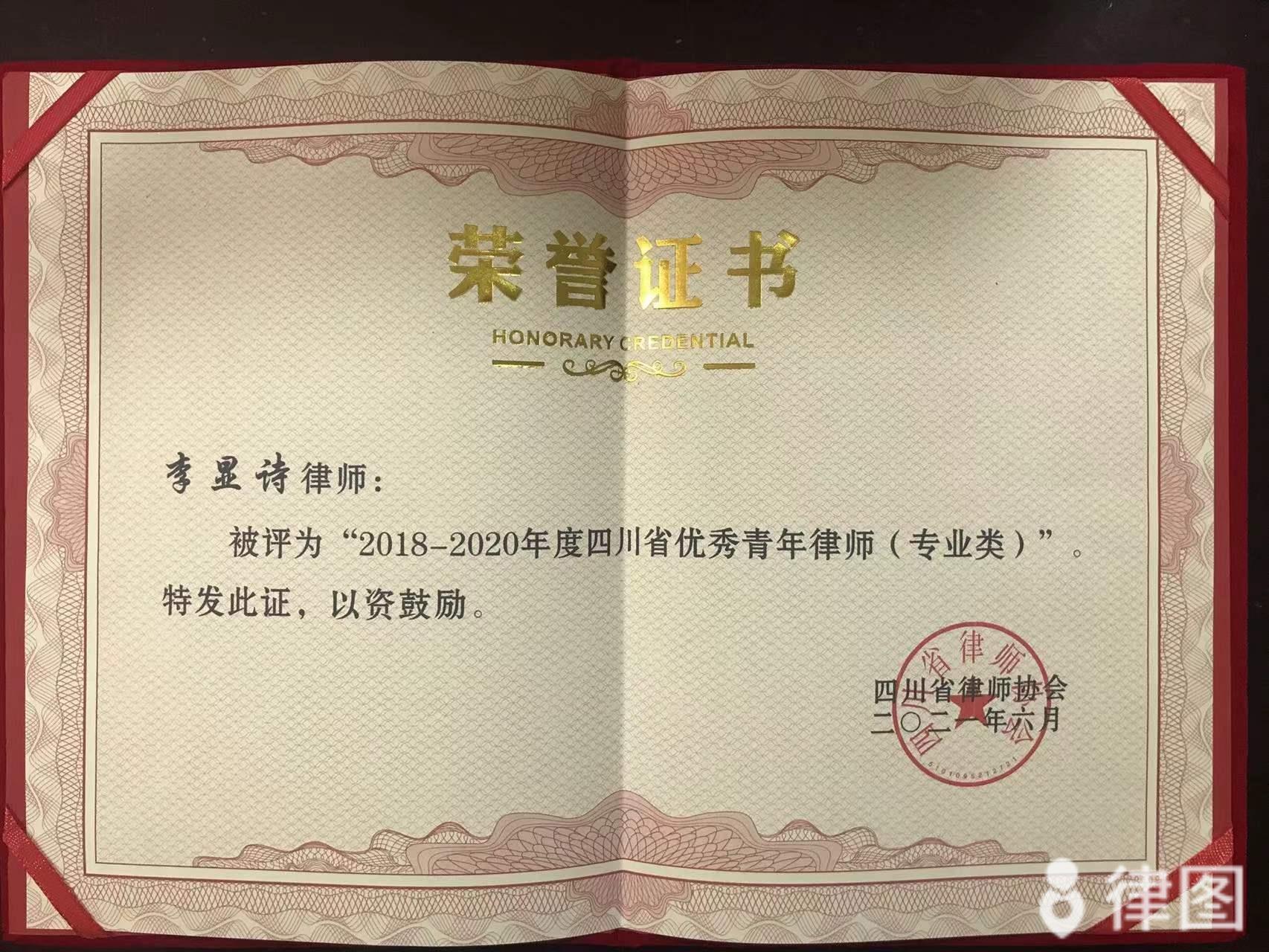 2021年6月被评为“2018-2020年度四川省优秀青年律师(专业类)”。