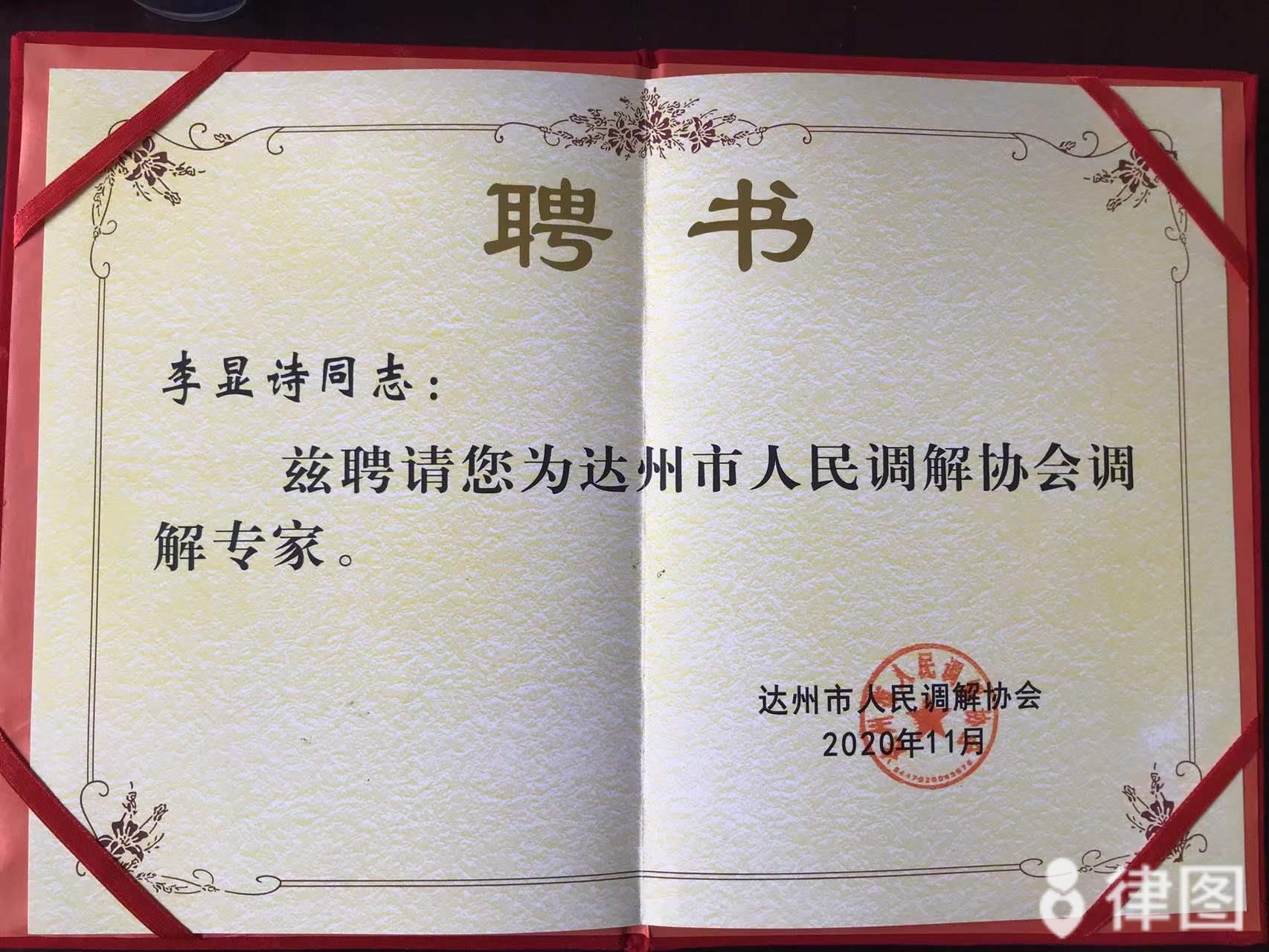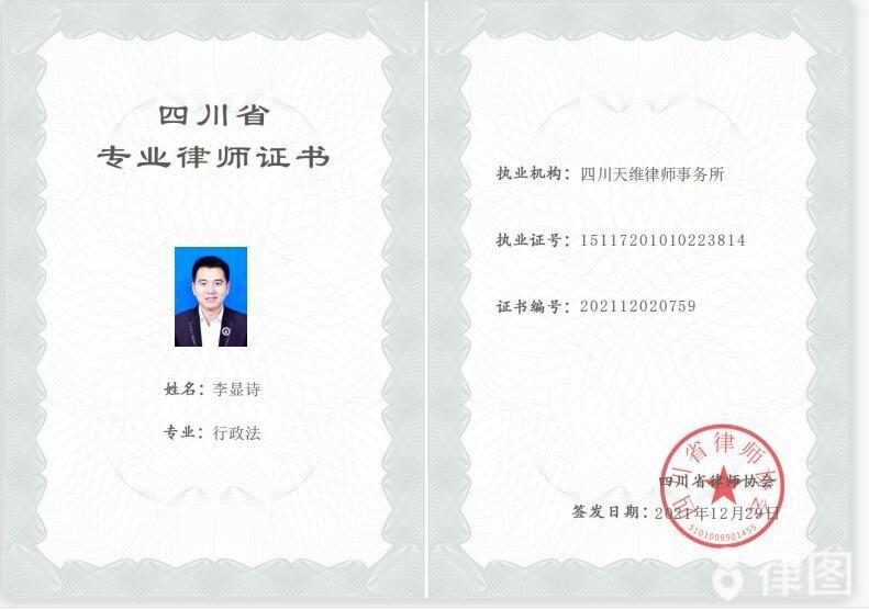 李显诗律师,系四川天维律师事务所高级合伙人,法律职业资格A证。于2008年在北京通过司法考试,取法律职业资格,于2010年开始从事律师工作,于2015年6月至今系四川天维律师事务所副主任。李显诗律师于2023年12月被达州市司法局评为达州市优秀律师,于2021年撰写的“陈某某涉嫌妨害动植物防疫、检疫罪案件一审辩护词”被评为四川省第三届律师“十佳辩护词”。于2020年11月被聘为达州市人民调解协会调解专家,系第二届达州市人民检察院人民监督员,于2013年至今一直为万源市党政法律顾问团顾问,于2024年10月被聘为达州仲裁委员会仲裁员。李显诗律师系达州市第五届律师协会理事和达州市第五届律师协会刑事专业委员会委员。
