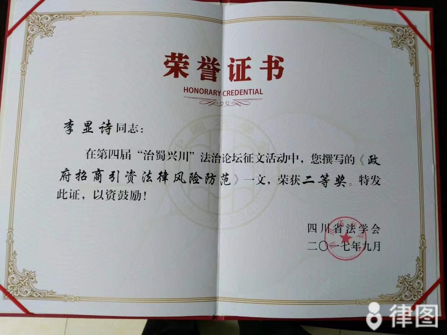 2017年9月在四川省法学会组织的第四届“治蜀兴川”法治论坛征文活动中,其撰写的《政府招商引资法律风险防范》荣获二等奖。